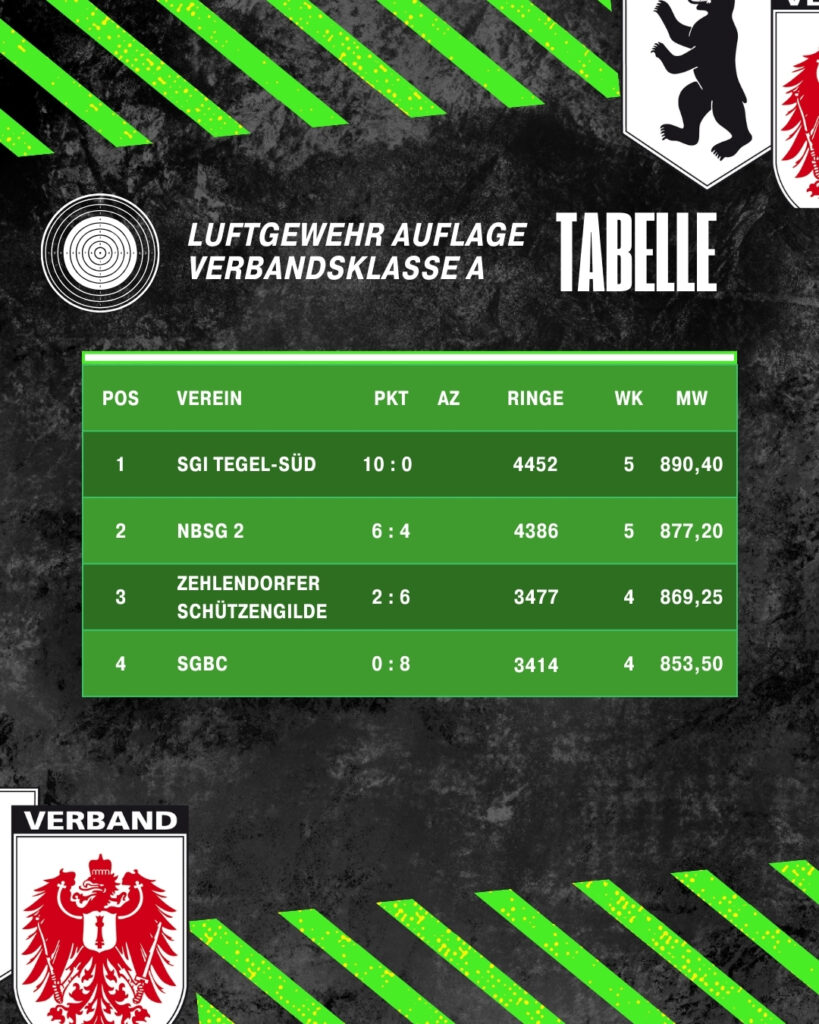 In der Tabelle steht das Team damit aktuell auf Platz 5. Dennoch bleibt die Ausgangslage spannend: Im abschließenden Wettkampf am 08.01. beim Schützen-Club Spandau ist mit einem Sieg sogar noch Tabellenplatz 3 möglich. Entsprechend motiviert wird die Mannschaft in dieses letzte Duell gehen.