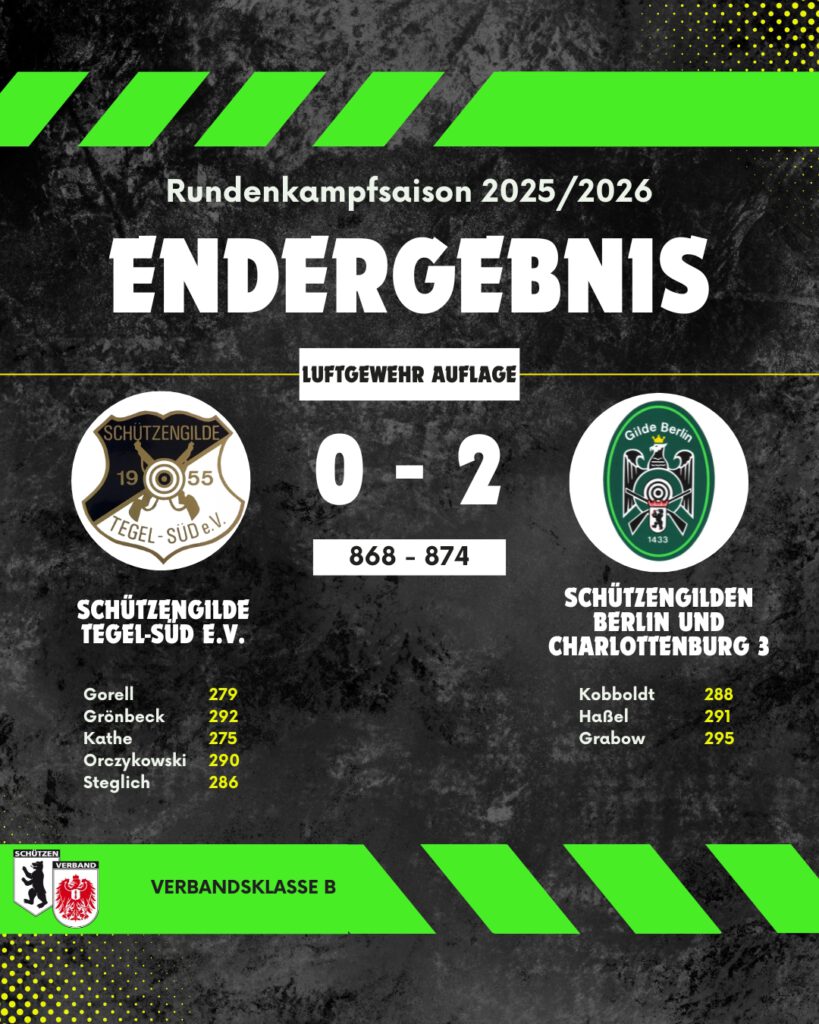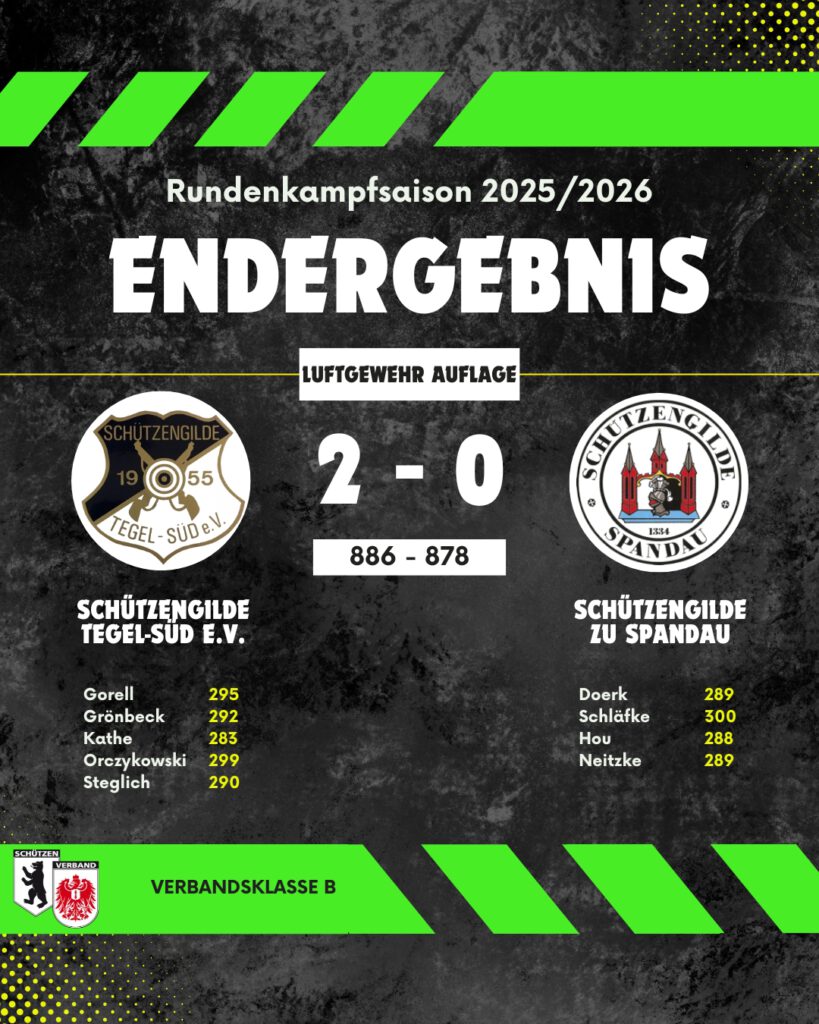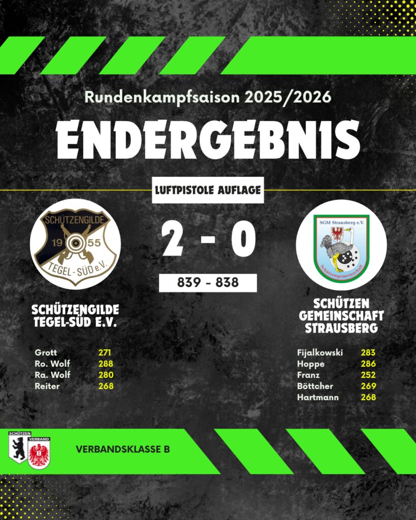 Damit steht unsere Mannschaft aktuell auf einem starken 2. Tabellenplatz. Nach einer kurzen Weihnachtspause geht es am 11.01.2026 bei der Berliner Schützengesellschaft um die letzten Punkte der Saison.