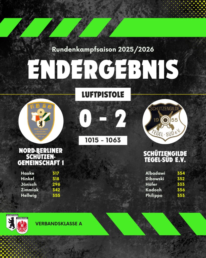 Zum Auftakt der neuen Saison empfing unsere Mannschaft den amtierenden Staffelsieger, die Nord-Berliner Schützen-Gemeinschaft (NBSG). Trotz einer starken Leistung – allen voran durch Sascha Dibowski, der mit 370 Ringen die Führung in der Einzelwertung übernahm – musste sich das Team am Ende mit 1024 : 1066 Ringen geschlagen geben.