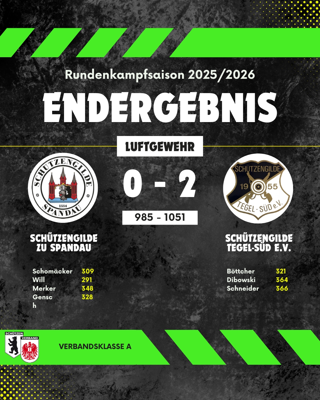 Damit steht unsere Mannschaft aktuell auf einem starken 2. Tabellenplatz. Nach einer kurzen Weihnachtspause geht es am 11.01.2026 bei der Berliner Schützengesellschaft um die letzten Punkte der Saison.