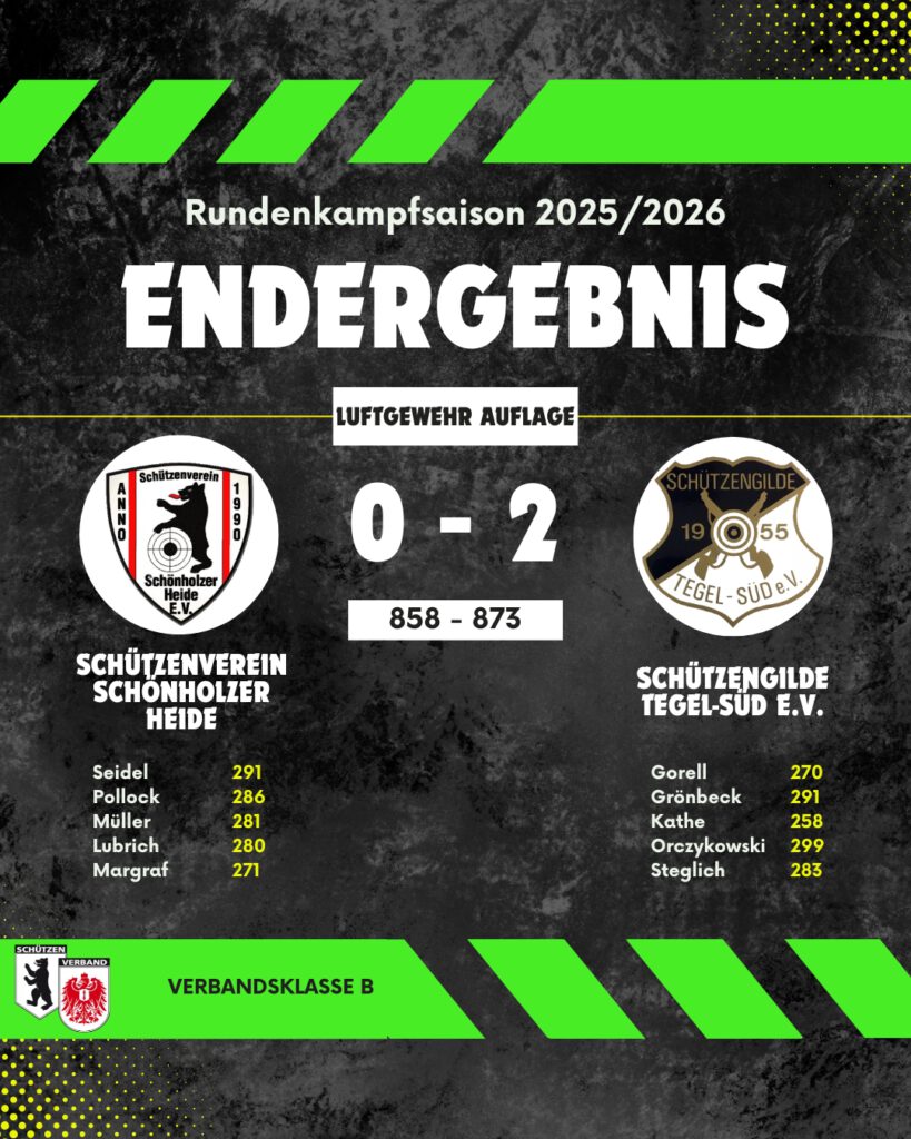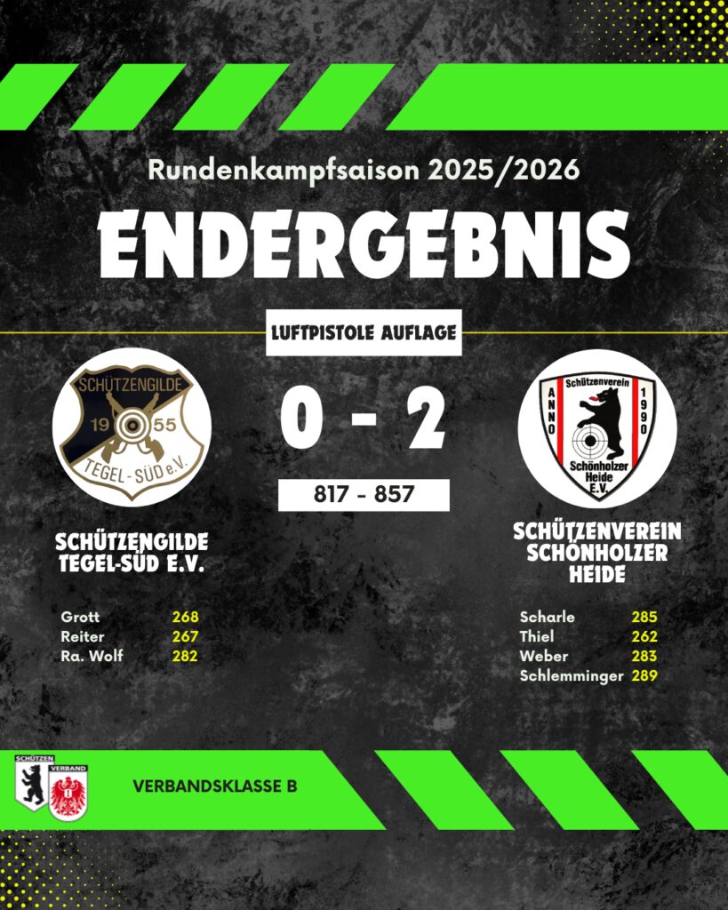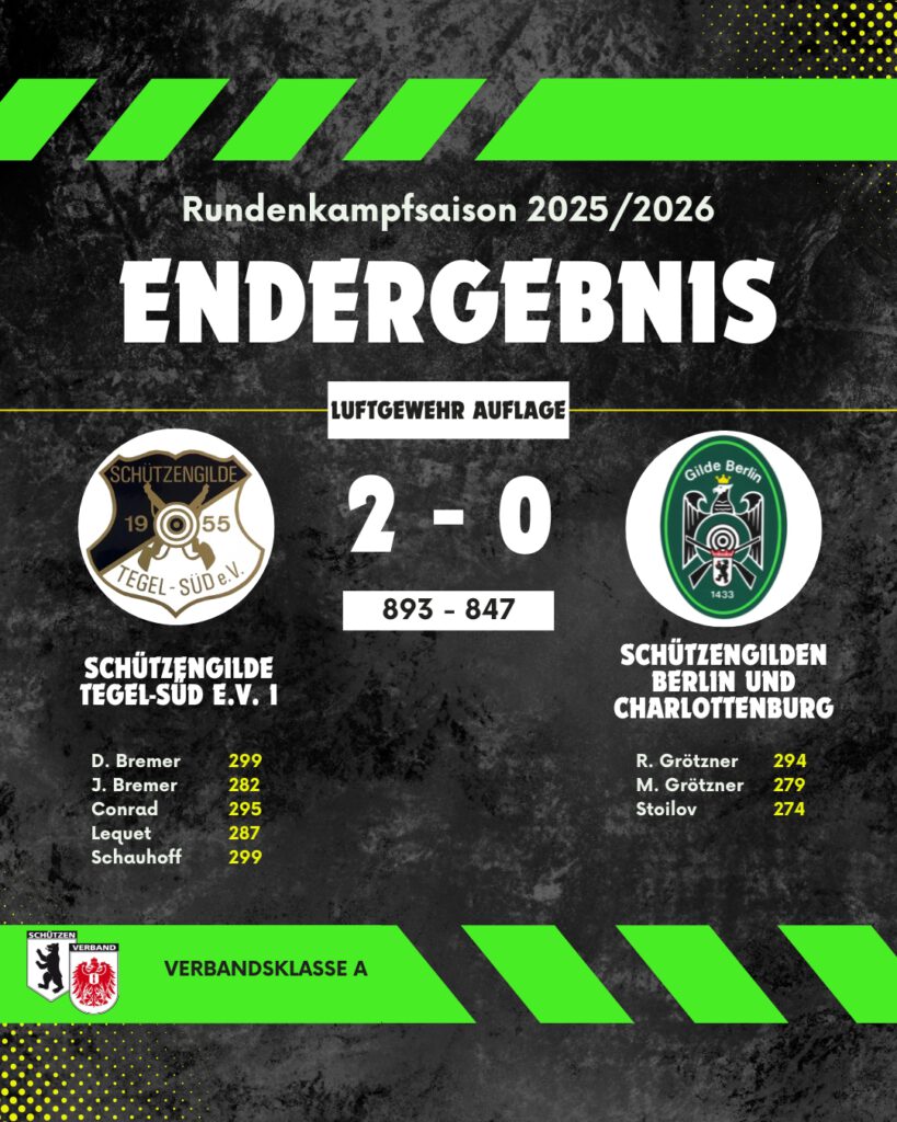 Die abschließende Begegnung am 11.01.2026 gegen die Zehlendorfer Schützengilde wird noch einmal höchste Konzentration erfordern. Trotz des bereits gesicherten Staffelsiegs ist das Ziel klar: Die starke Saison soll mit einem weiteren Erfolg gekrönt und ohne Punktverlust abgeschlossen und in der Einzelwertung die Plätze 1-3 verteidigt werden.