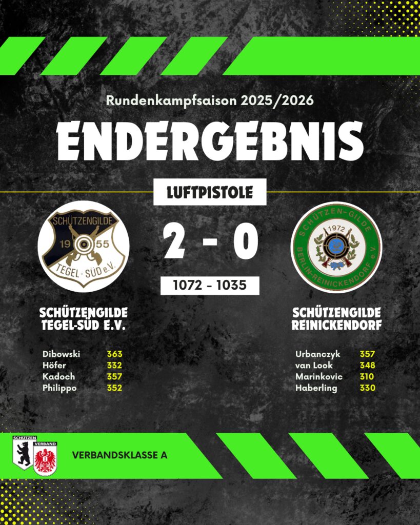 Im Duell gegen unsere Freunde von der Schützengilde Reinickendorf konnte ein souveräner 1072 : 1035-Heimsieg eingefahren werden.