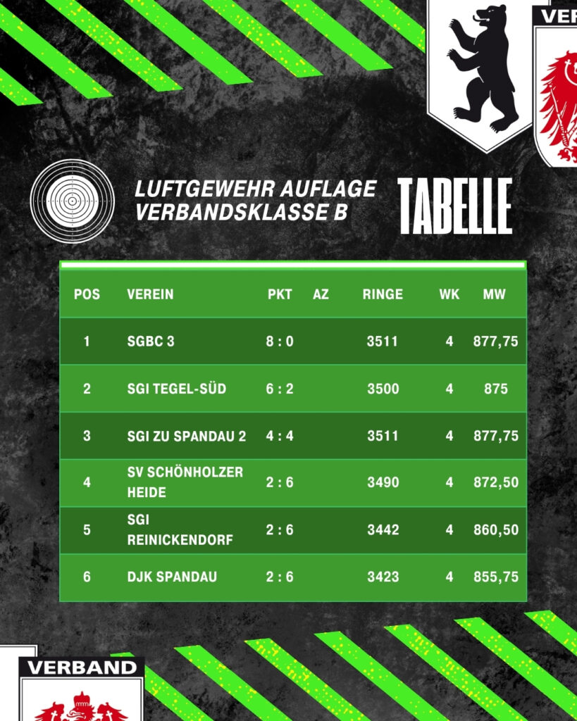 In der Tabelle steht das Team damit aktuell auf Platz 5. Dennoch bleibt die Ausgangslage spannend: Im abschließenden Wettkampf am 08.01. beim Schützen-Club Spandau ist mit einem Sieg sogar noch Tabellenplatz 3 möglich. Entsprechend motiviert wird die Mannschaft in dieses letzte Duell gehen.