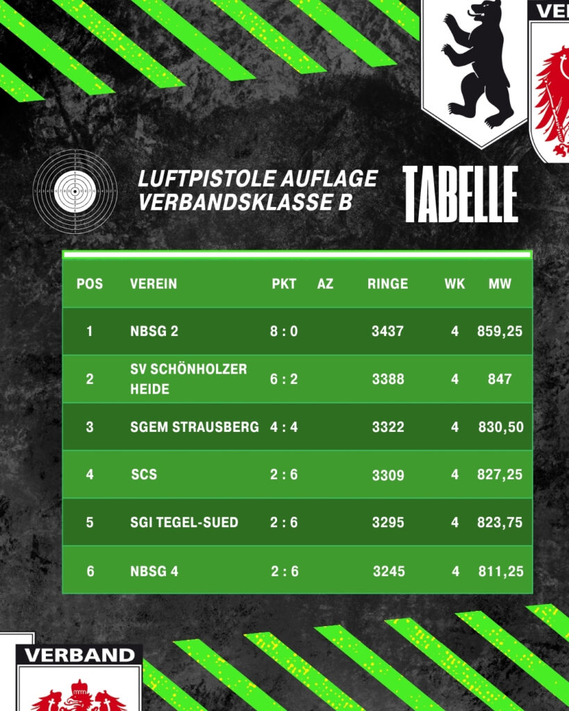 Zum Saisonabschluss wartet am 11.01.2026 jedoch noch einmal eine echte Herausforderung: Auswärts beim Spitzenreiter der Nord-Berliner Schützen-Gemeinschaft, der sich aktuell in herausragender Form präsentiert. Mit einem Vorsprung von zwei Punkten und 92 Ringen ist der Staffelsieg für die NBSG rechnerisch kaum noch erreichbar. Dennoch geht unsere Mannschaft hochmotiviert in den letzten Wettkampf, um eine überzeugende Teamleistung zu zeigen und sich in den Einzelwertungen bestmöglich zu platzieren.