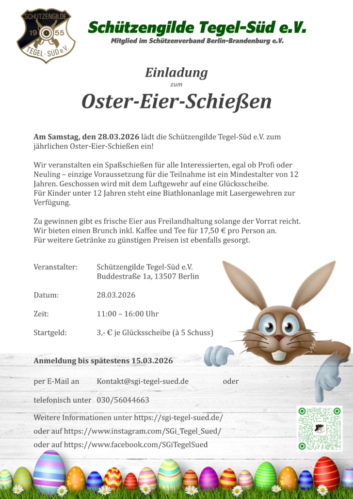 Am Samstag, den 28. März 2026, lädt die Schützengilde Tegel-Süd e.V. herzlich zum nächsten Oster-Eier-Schießen auf ihr Vereinsgelände ein. Eingeladen sind nicht nur Schützinnen und Schützen aus befreundeten Schützen- und Bogensportvereinen, die diese Veranstaltung seit Jahren begleiten, sondern ausdrücklich auch alle Interessierten, die das Sportschießen einmal ganz unverbindlich ausprobieren möchten.
