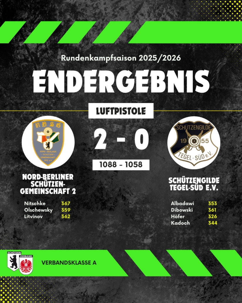 Zum Saisonabschluss gelang unserer Luftgewehrmannschaft ein knapper, aber verdienter 1057 : 1052-Auswärtssieg bei der Berliner Schützengesellschaft.