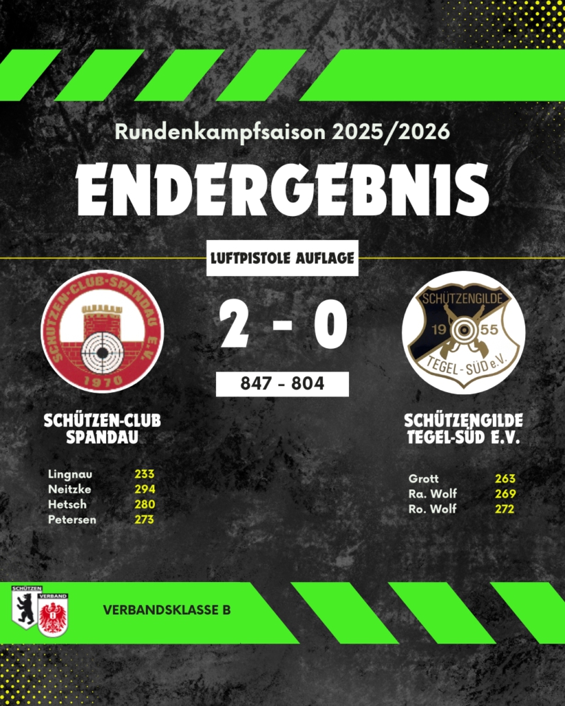 Im letzten Wettkampf der Saison konnte unsere Auflage-Mannschaft leider keine weiteren Punkte sammeln. Beim Schützen-Club Spandau musste eine 804 : 847-Niederlage hingenommen werden.