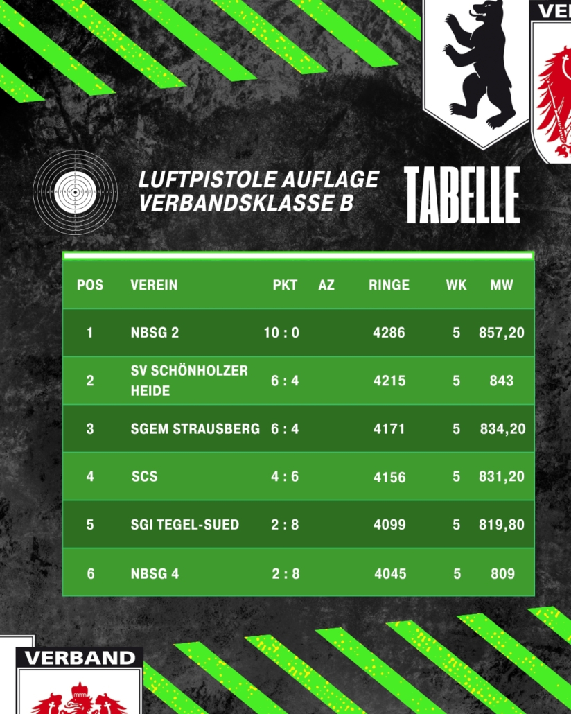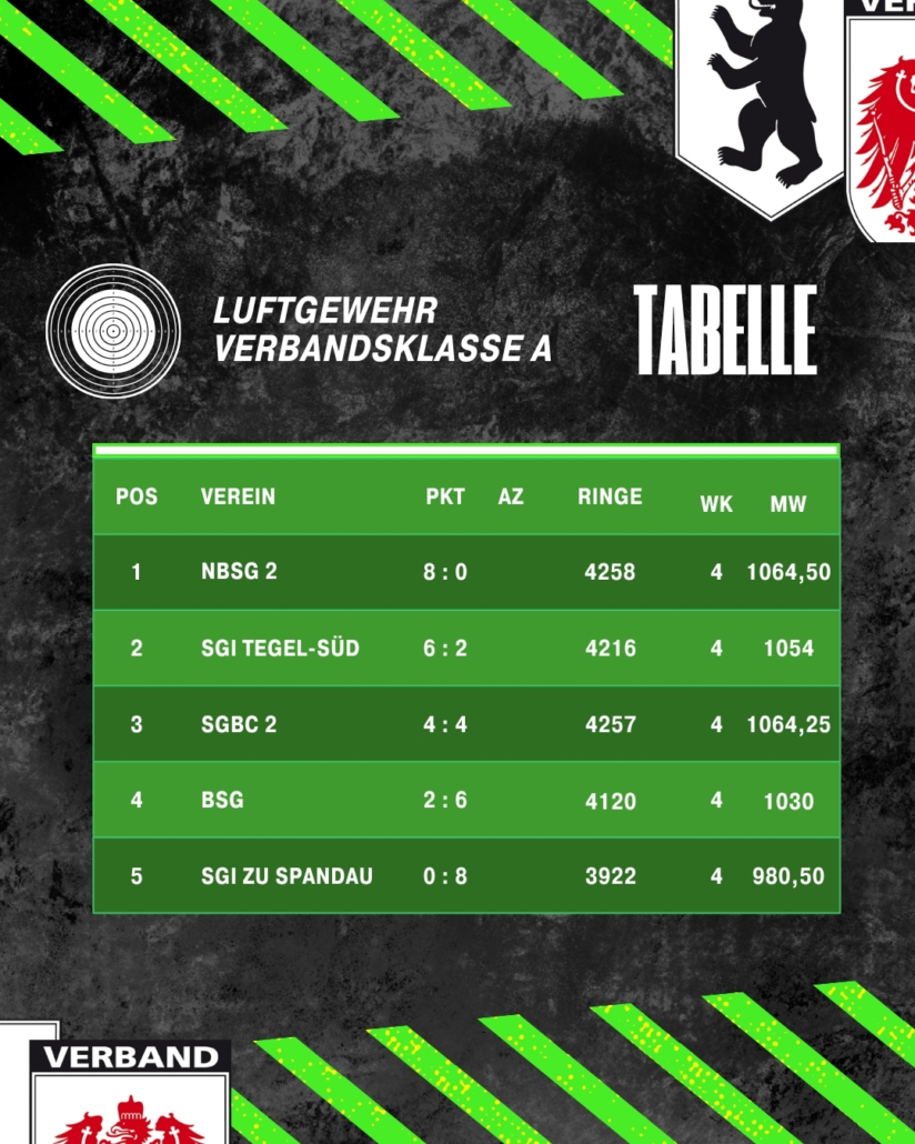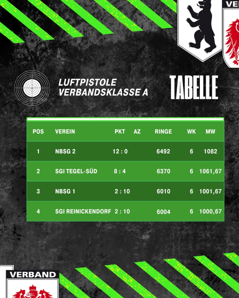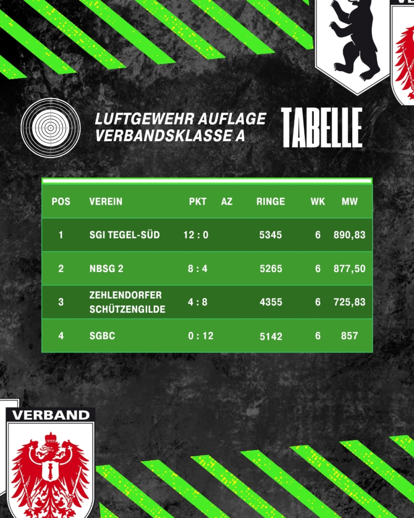 Die bereits als Staffelsieger feststehende Mannschaft traf im letzten Wettkampf auf die Zehlendorfer Schützengilde, die krankheitsbedingt leider nicht antreten konnte – an dieser Stelle gute Besserung.