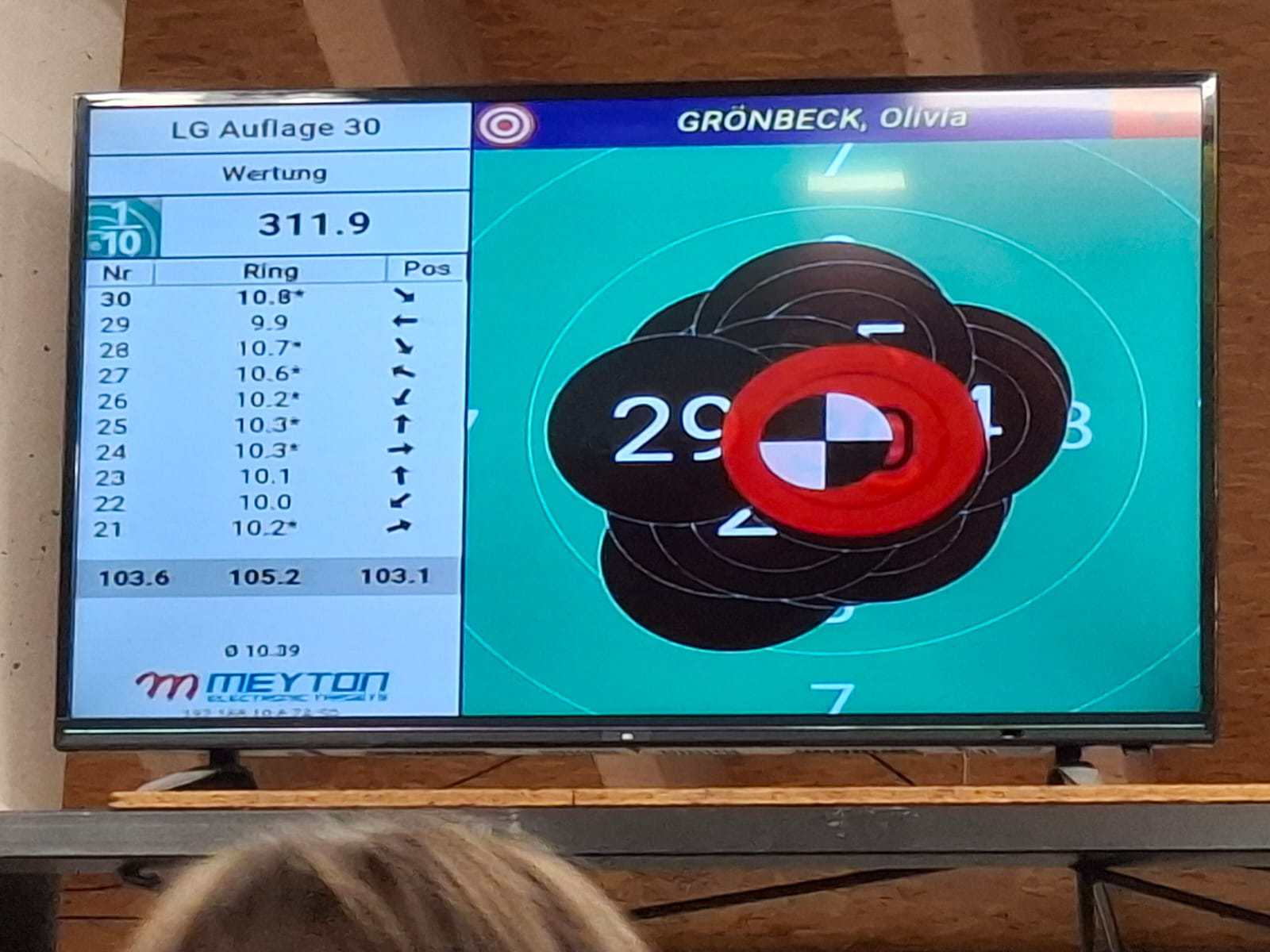 In der Wertung der Seniorinnen I und II erreicht Olivia 311,9 Ringe und ist ringgleich mit Platz 6, aber aufgrund der schlechteren letzen Serie holt sie am Ende einen guten 7. Platz.